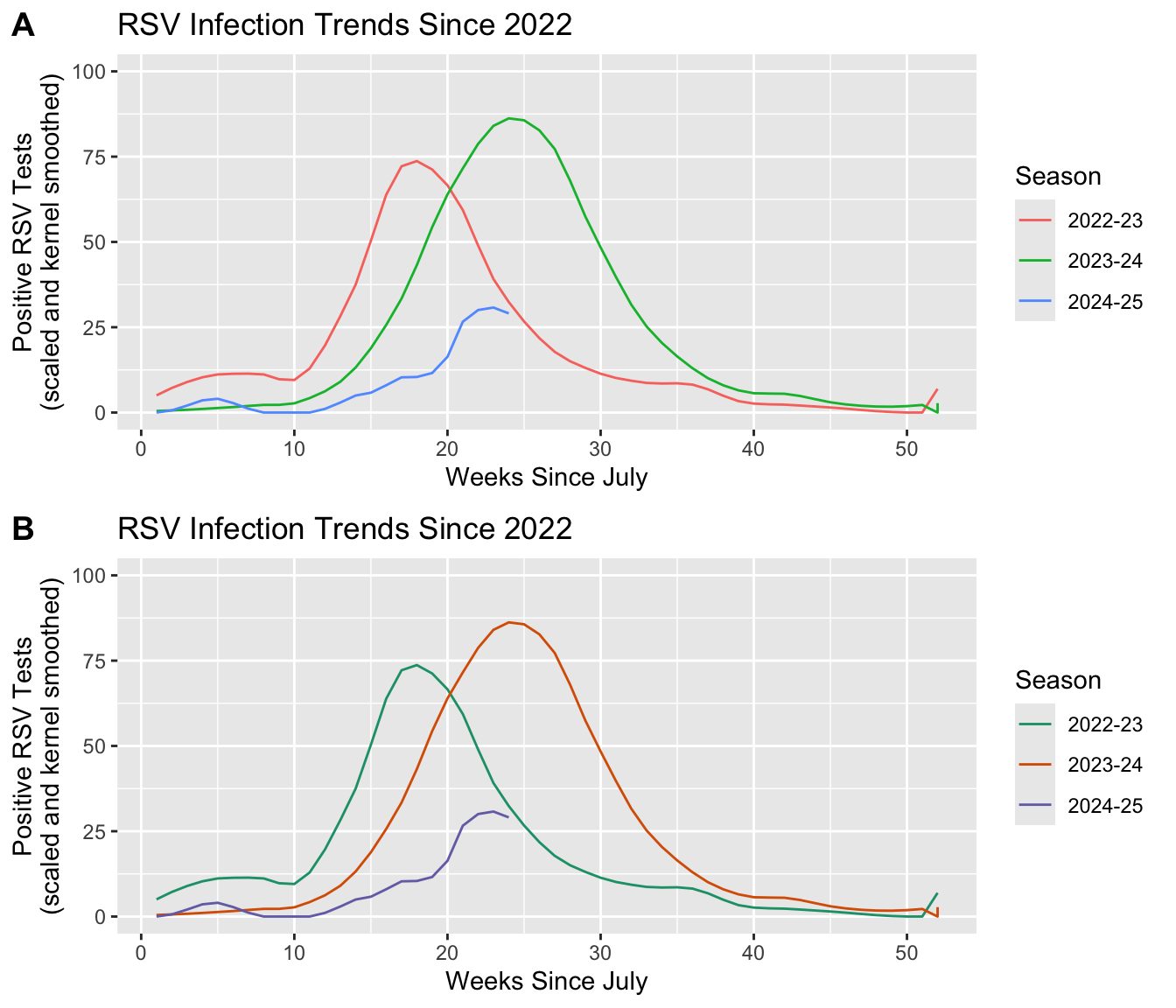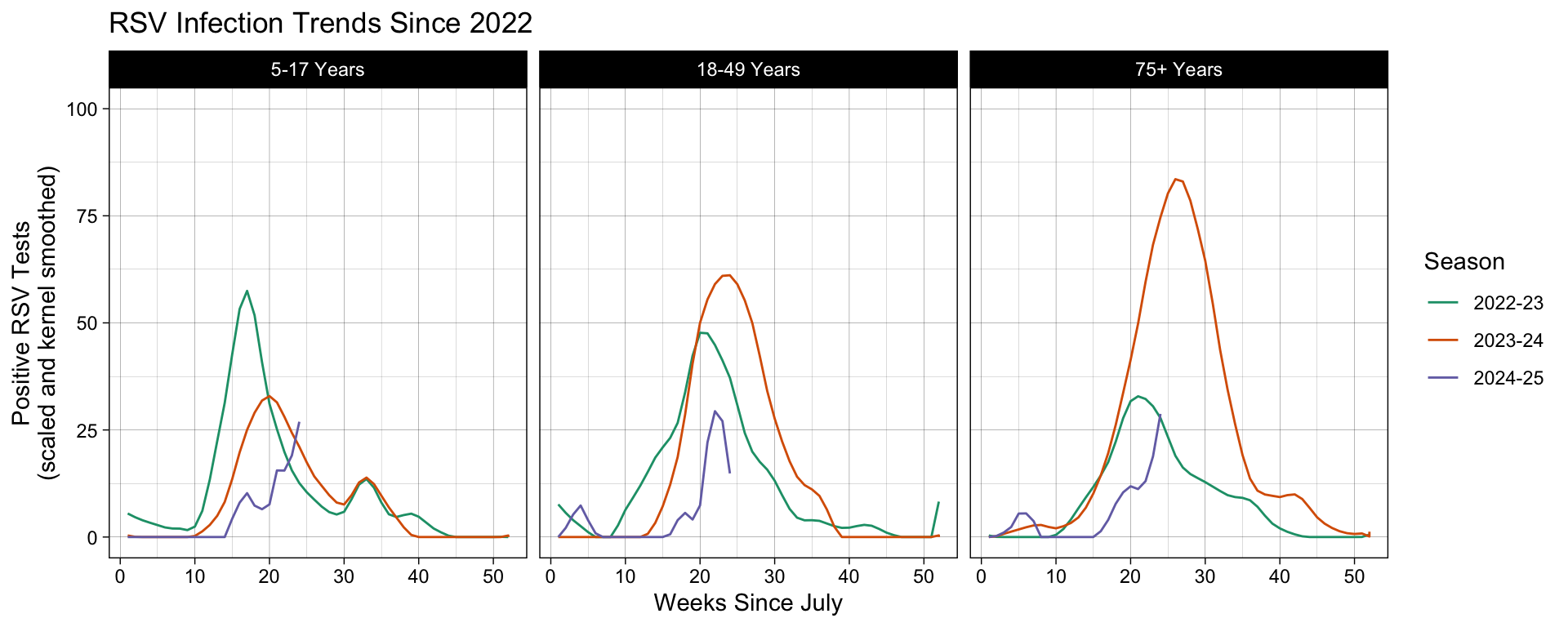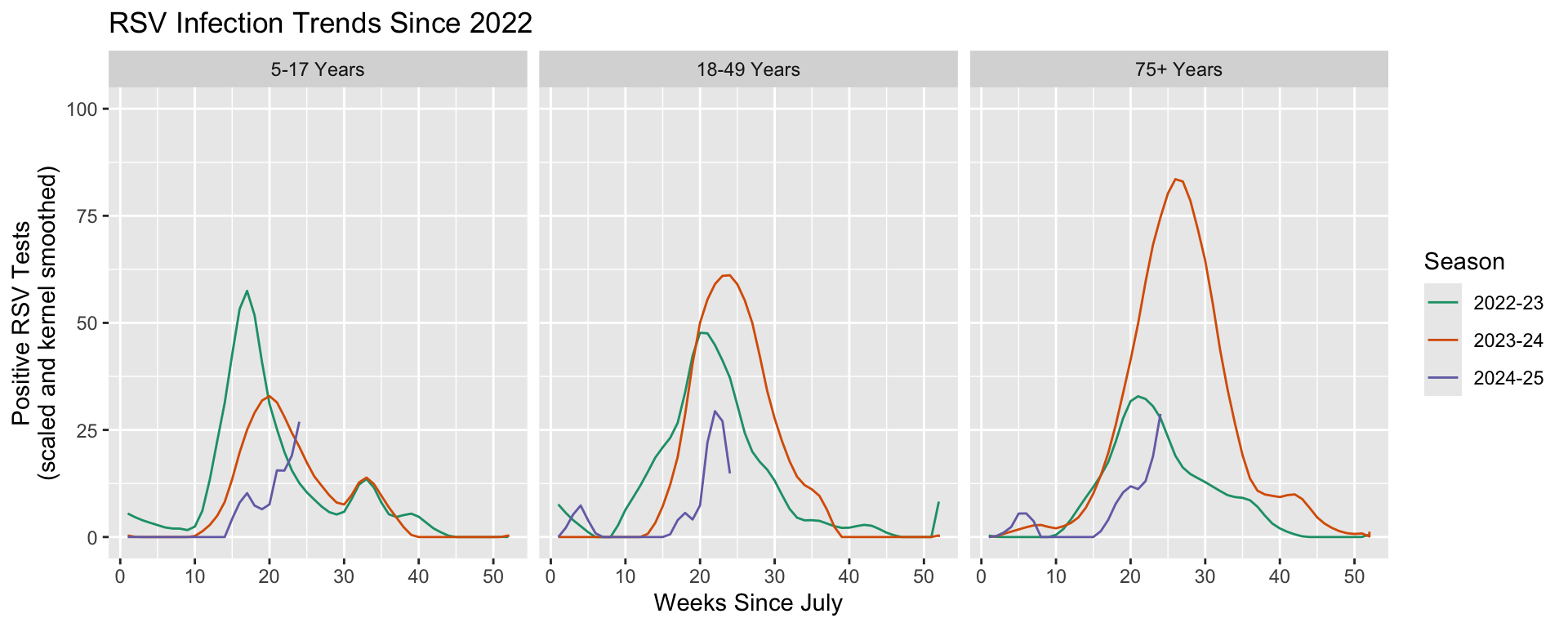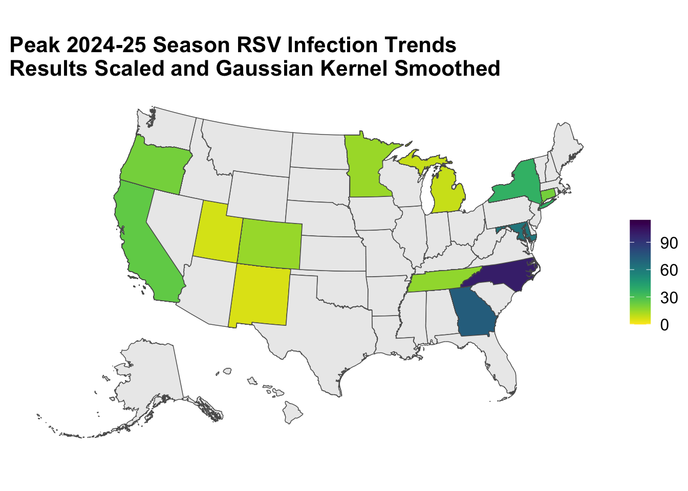 labs(fill = NULL, title = "Peak 2024-25 Season RSV Infection Trends\nResults Scaled and Gaussian Kernel Smoothed") +