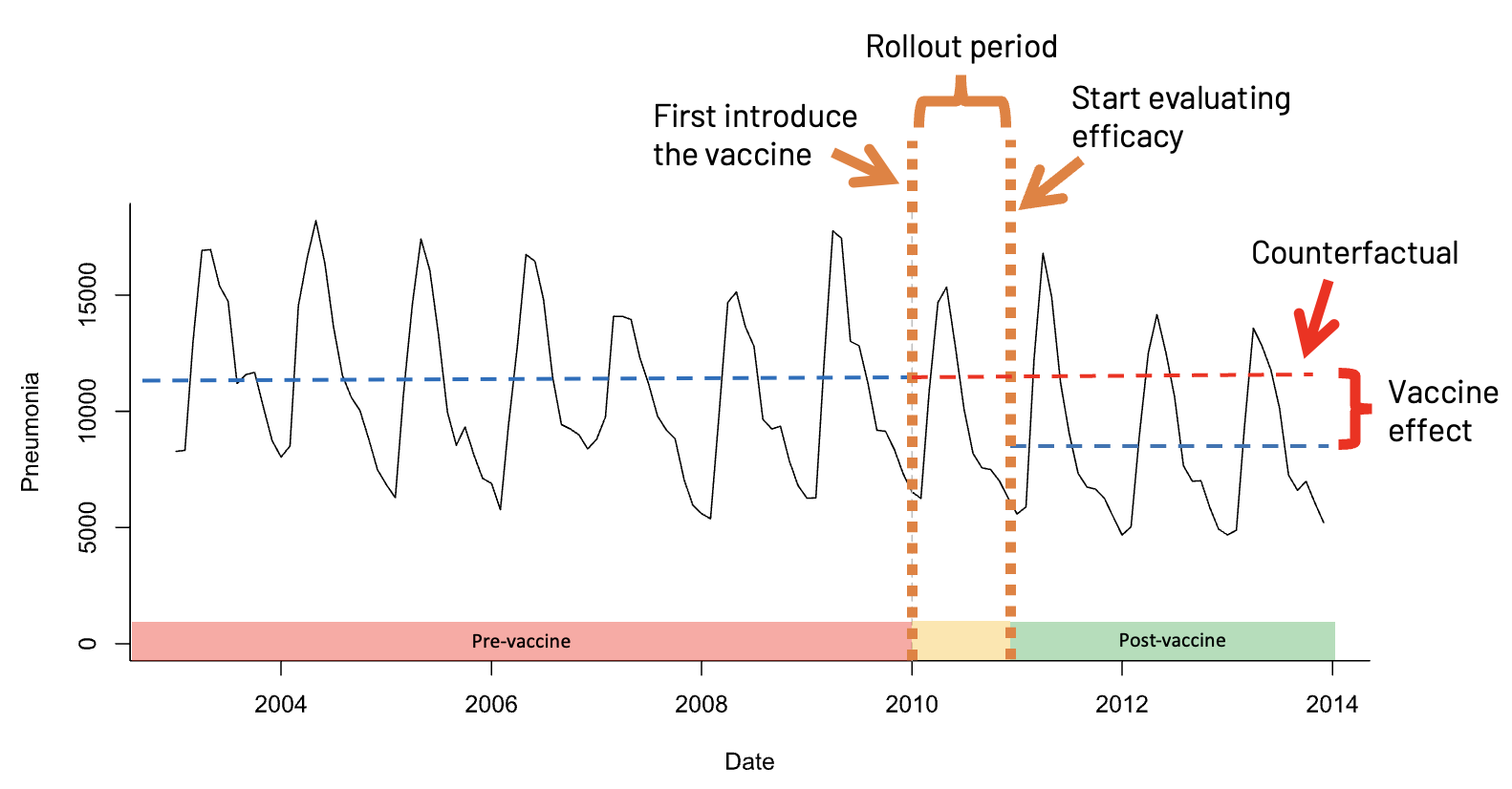 We can appreciate that this is a Sisyphean task, but one that can be addressed with time series analysis. Keep in mind that the methods discussed here are most applicable to endemic diseases that are consistently present in the population, existing at a relatively stable and predictable level. The core reason is that these methods require us to have an idea of what we would expect to have seen had the vaccine not been introduced, allowing us to posit a realistic counterfactual for model evaluation.