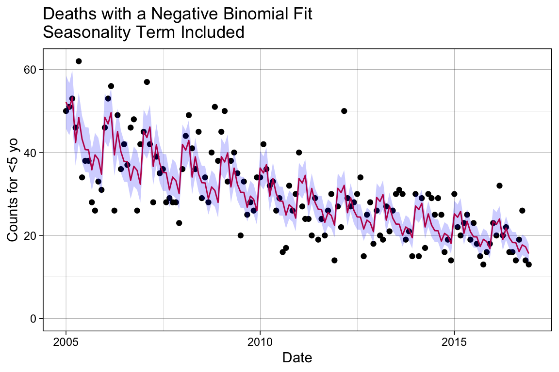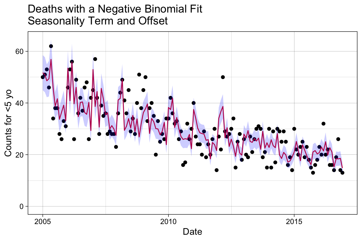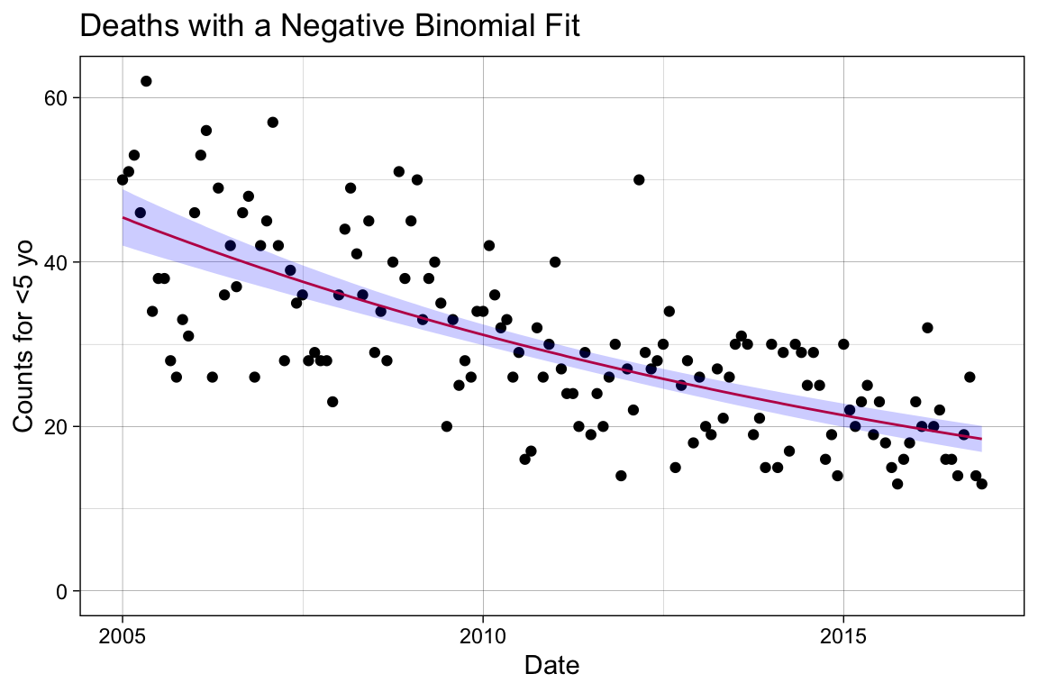 Variables that reflect counts (i.e., the number of deaths per month) can be distributed as either Poisson or negative binomial. Note that Poisson regression may artificially narrow confidence intervals when the data is overdispersed. To address this, you can use a negative binomial regression or a quasipoisson model, which accounts for the unexplained variation. In this context, we will apply a negative binomial regression.