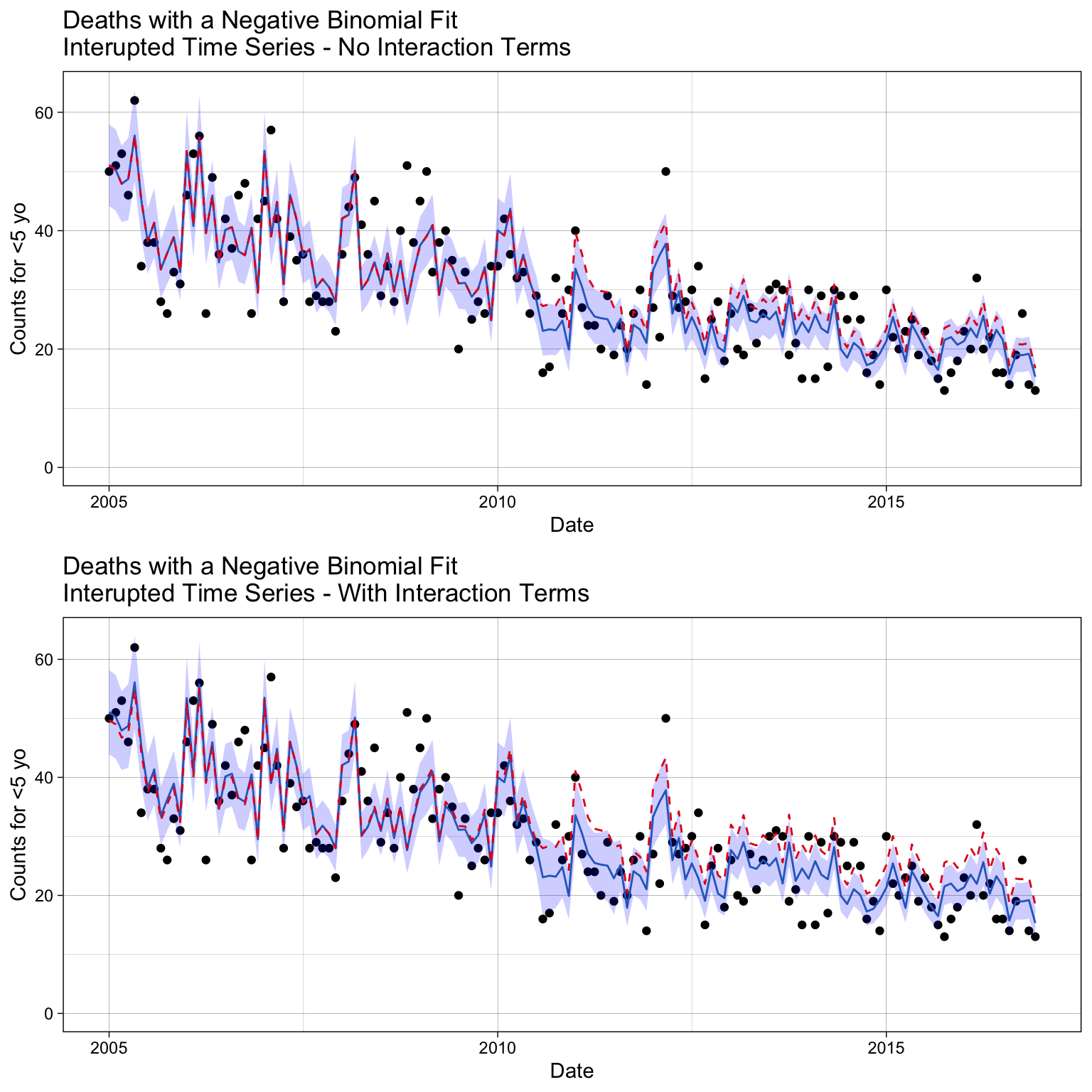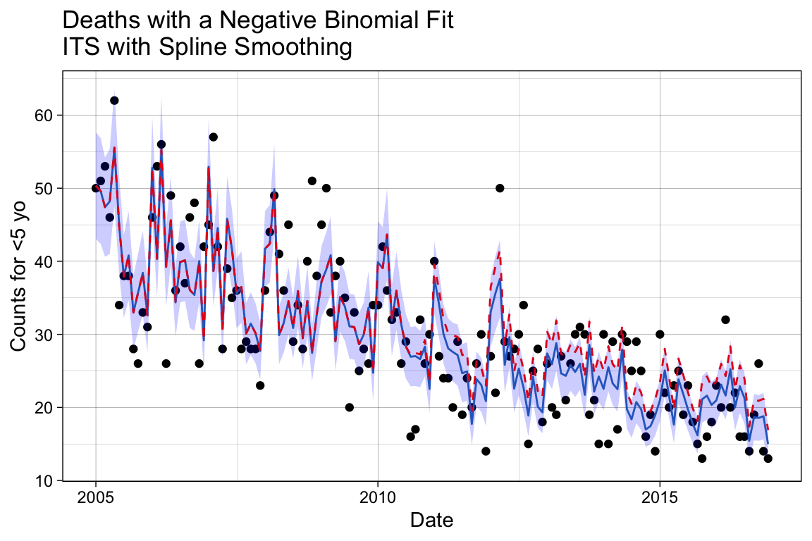labs(title = "Deaths with a Negative Binomial Fit\nITS with Spline Smoothing",