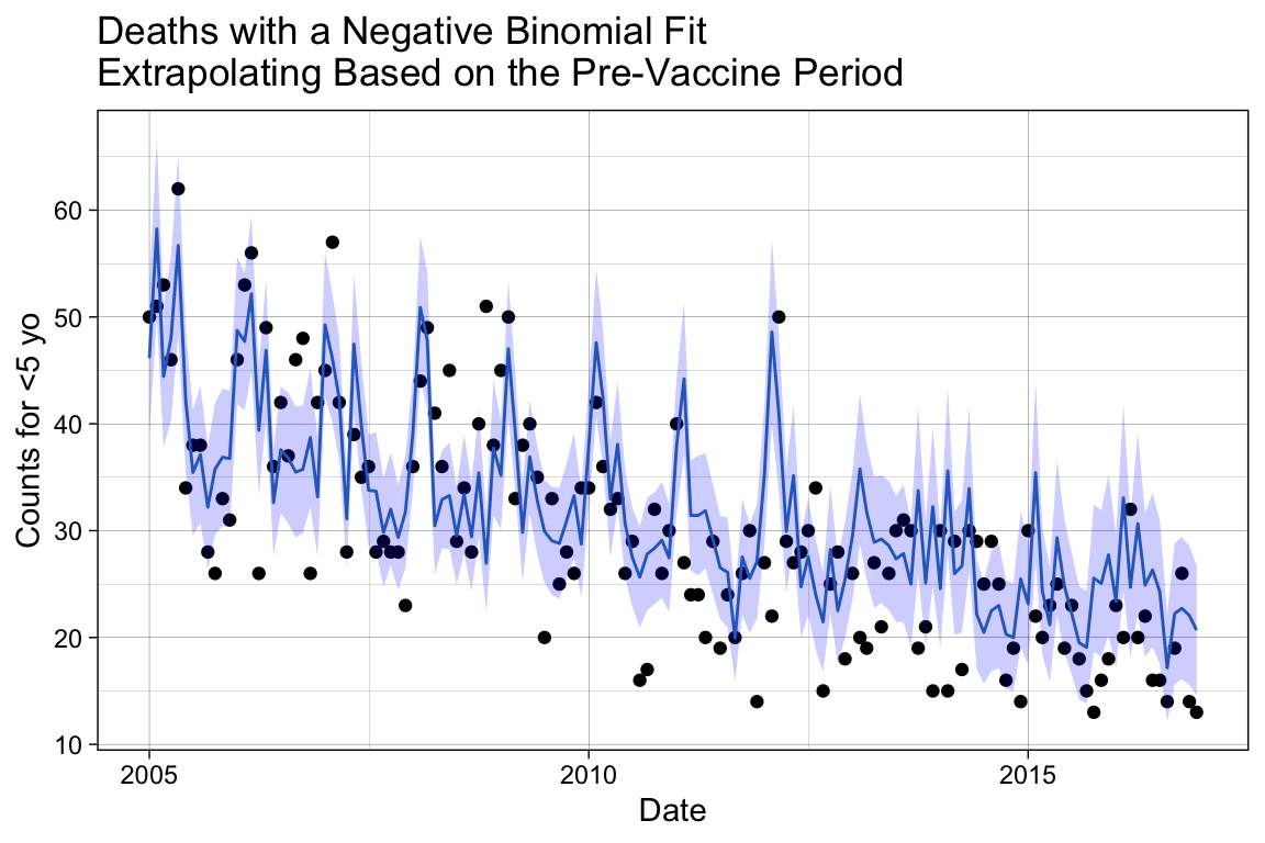 labs(title = "Deaths with a Negative Binomial Fit\nExtrapolating Based on the Pre-Vaccine Period",