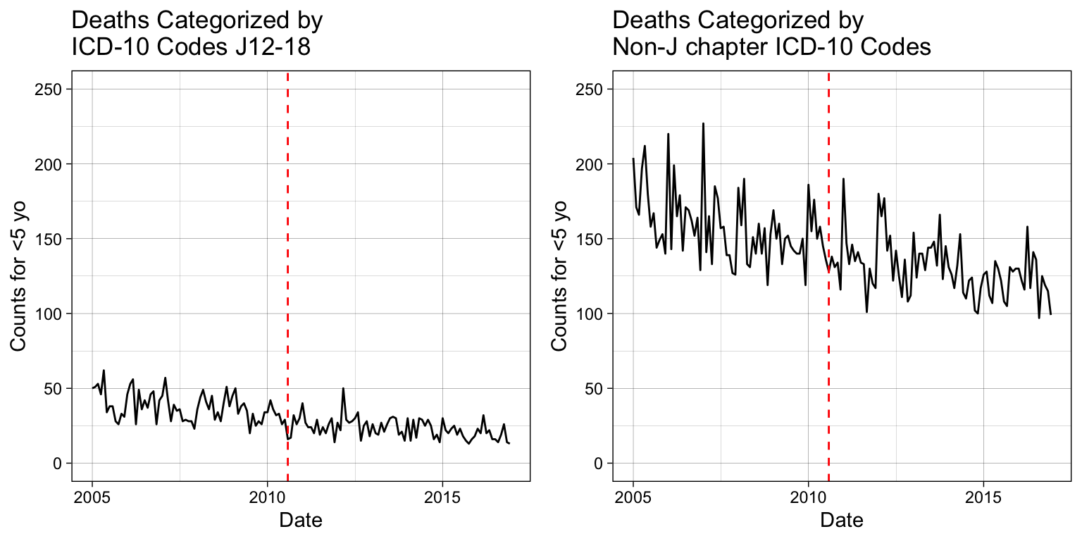 The data used here is a subset of the complete set used in Oliveira, L. H. D. et al. 2020 3. In their paper, national-level mortality data spanning from 2000 to 2016 for children under 5 years of age was compiled and standardized by national mortality registers in 10 Latin American and Caribbean countries. The primary cause of death was classified using the International Classification of Diseases, Tenth Revision (ICD-10) codes (Influenza and pneumonia J09-J18 or Oliveira, L. H. D. et al. 2020 Supplementary Table 2) 4,5. The goal of the paper was to evaluate the efficacy of pneumococcal conjugate vaccines (PCVs) in children who received any part of the standard-of-care vaccination series.
