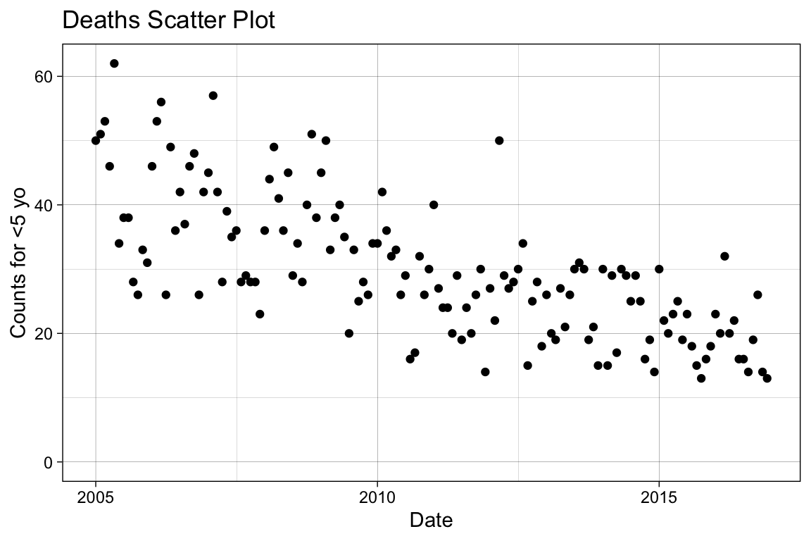 We begin each time series analysis by examining the entire span of data, typically plotted as a line or scatter plot. All methods for modeling the vaccination introduction time series data require the dates when the vaccine was introduced, in this case the PCV10 vaccine.